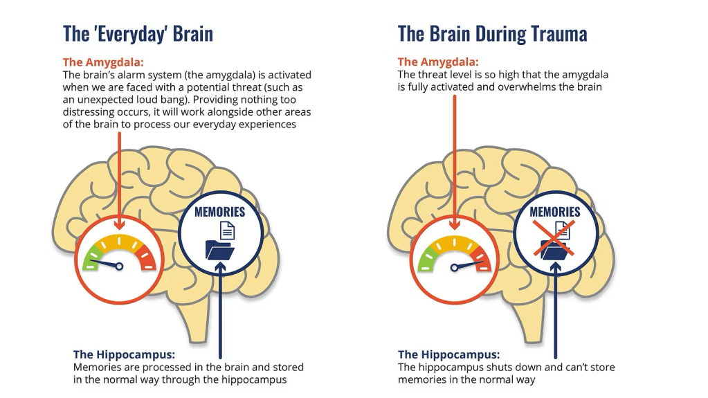 During trauma, rational processing systems like the hippocampus shut down, causing the emotional and survival-focused amygdala to go into overdrive.