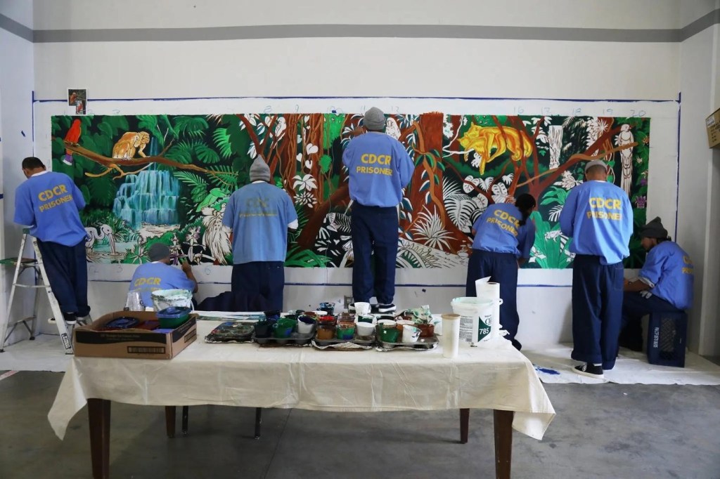 Incarcerated people in a mural class at Salinas Valley State Prison in Soledad, Calif. The class is part of an initiative to bring the arts to all 35 California state prisons for adults. Credit: Jim Wilson/The New York Times