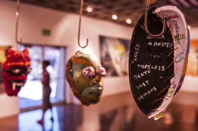 Source: Sculptural masks created by Iraq and Afghanistan war veterans hang in the Southwestern University art gallery. (Photo Credit: U.S. Army)
